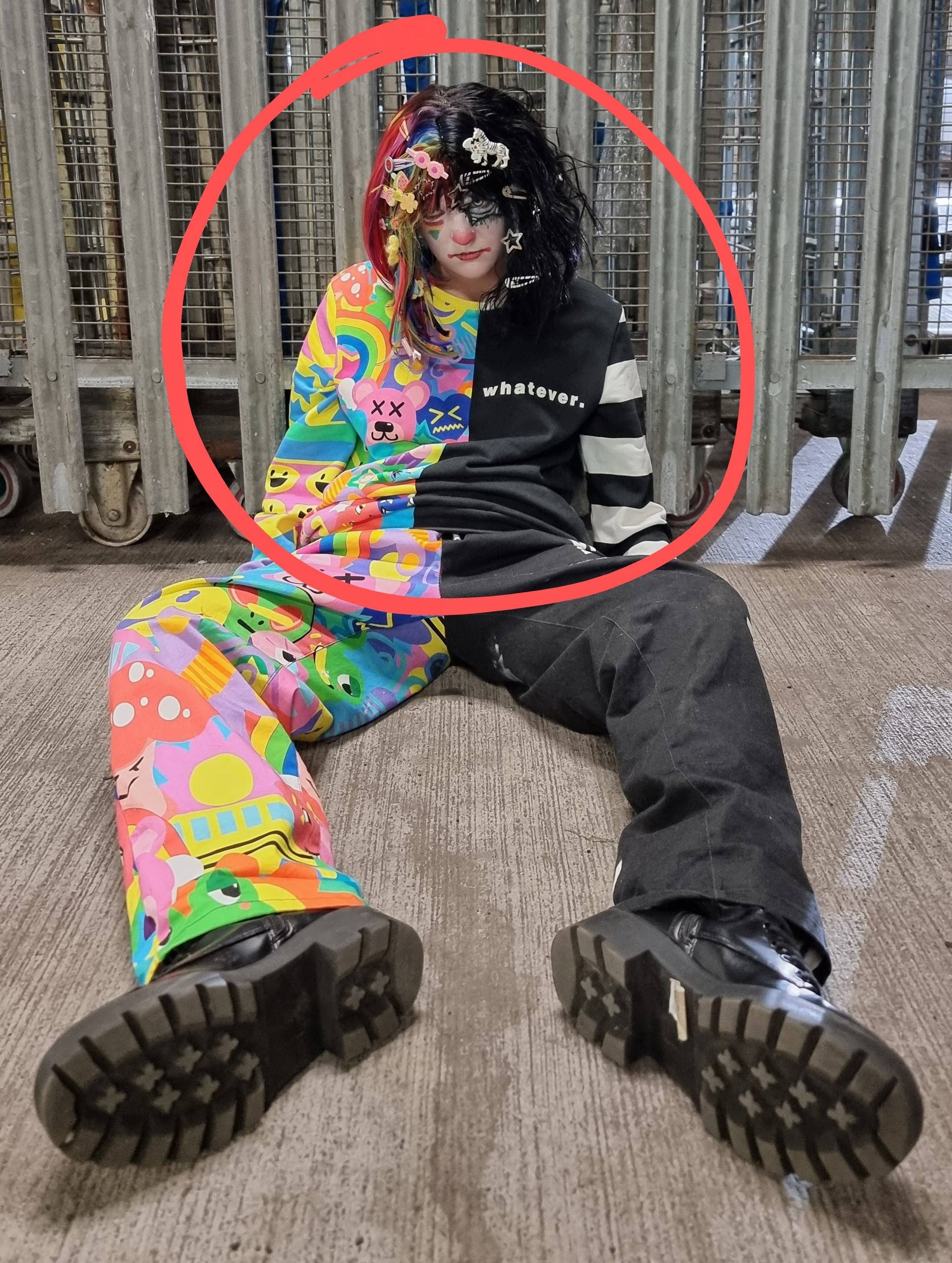 When I started working on designs, I knew I wanted SOMETHING that was just an explosion of fun and randomness. So let me proudly introduce to you - the Funk Freakout Sweater!!! (but it has to say 'whatever' at the same time so you know we aren't too bothered, y'know? Let's not get ahead of ourselves here. Admit it - you were getting ahead of yourself, weren't you? I just exhaled loudly out of my nose for you. Boy, this is sure getting long for a bracket blurb. I should probably like, close it. But why would I? Why don't I just keep going? I could write a fun little fanfiction or something in here, it would at least be original for a clothing description. Or I could tell you about what I had for breakfast? Ugh. Nevermind. It's just getting awkward now. The end.)